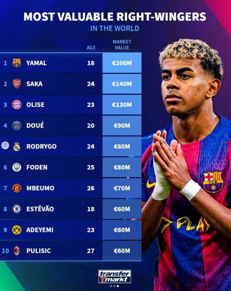 对俱乐部而言,这份榜单为引援提供了明确参考:想押注未来,可追逐亚马尔这类 “潜力股”;想冲击成绩,萨卡、奥利塞这样的 “即战力” 更划算。正如德转的估值往往与实际转会费相差仅 5%,这些身价数字已成为转会市场的 “定价基准”。随着右边锋在战术体系中愈发重要,“速度 + 创造力 + 潜力” 的价值公式,将持续主导该位置的身价排序。