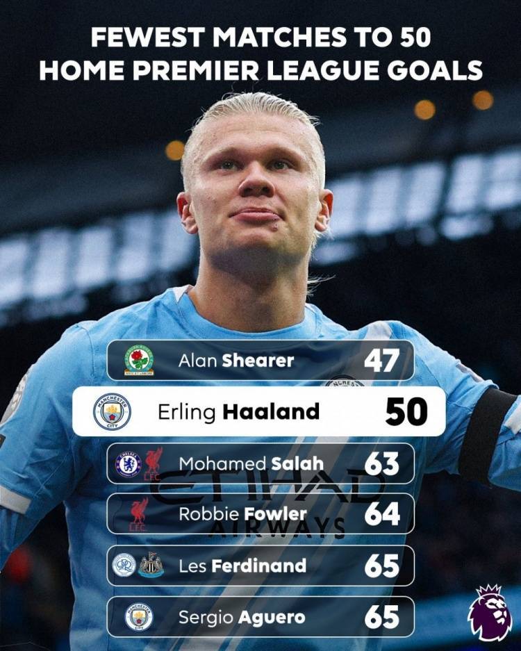在曼城3-0曼联的比赛中,哈兰德梅开二度,完成英超主场50球里程碑。英超历史上,只有希勒主场50球的效率更高。